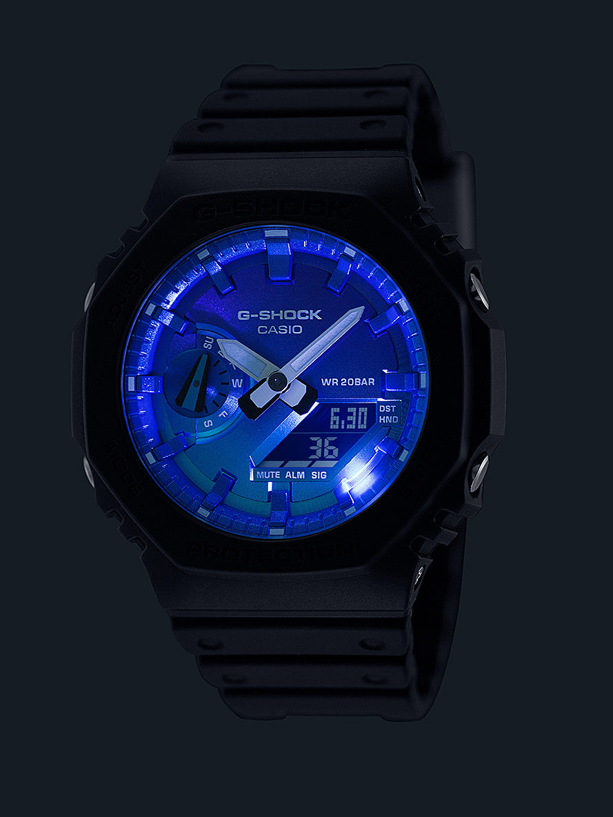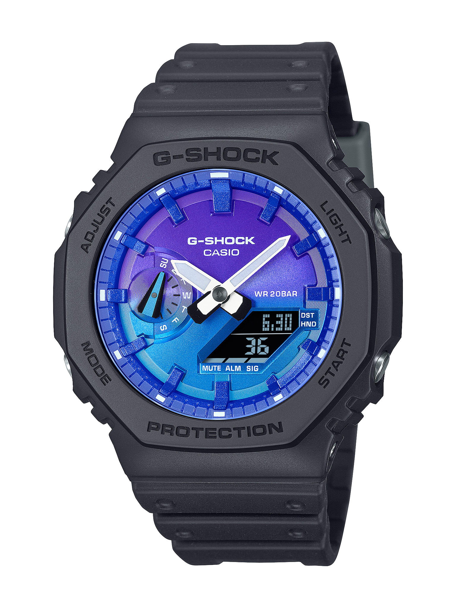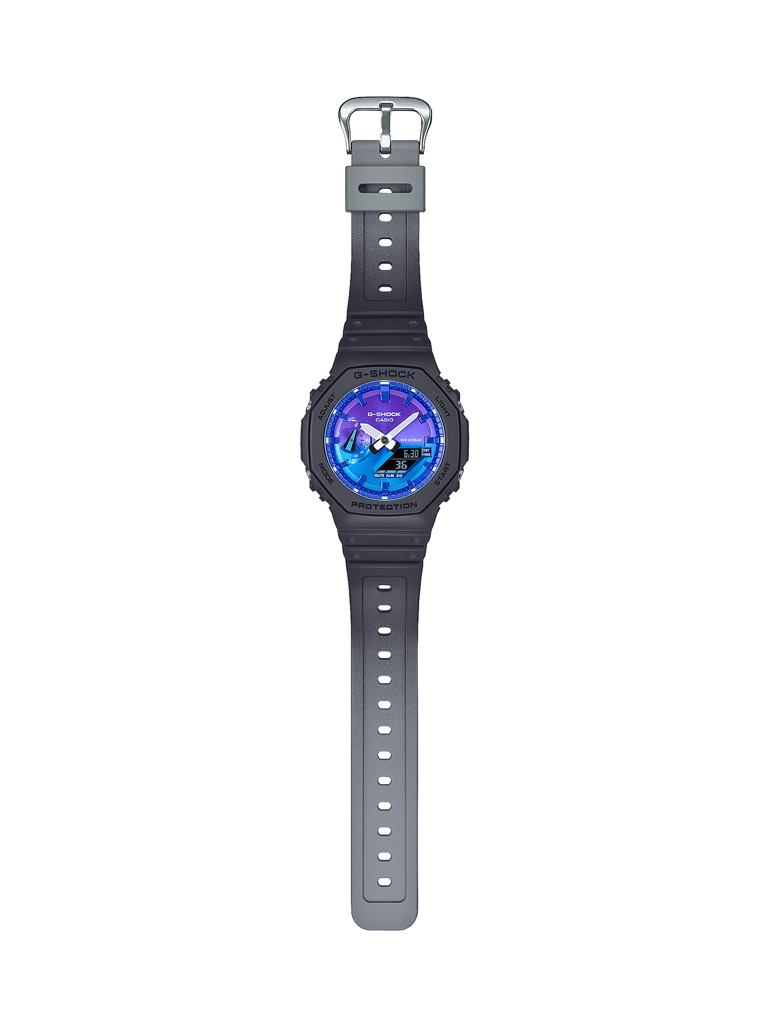 The GA-100FL-1A and GA-2100FL-1A have black bodies with a grey gradient finish that evokes the imagery of white smoke, complemented by cool blue gradient vapour deposition dials that represent the intense heat of flames. The GA-100FL-8A and GA-2100FL-8A, on the other hand, feature grey bodies with black gradient finishes that suggest dark smoke, paired with energetic orange gradient vapour deposition dials that symbolise the lower temperatures of a flame. The dials have vapour deposition finishes that showcase the two vibrant colours of cool blue and energetic orange. The black and grey of the bands recall the image of smoke and are accentuated by the striking colours of the dials.