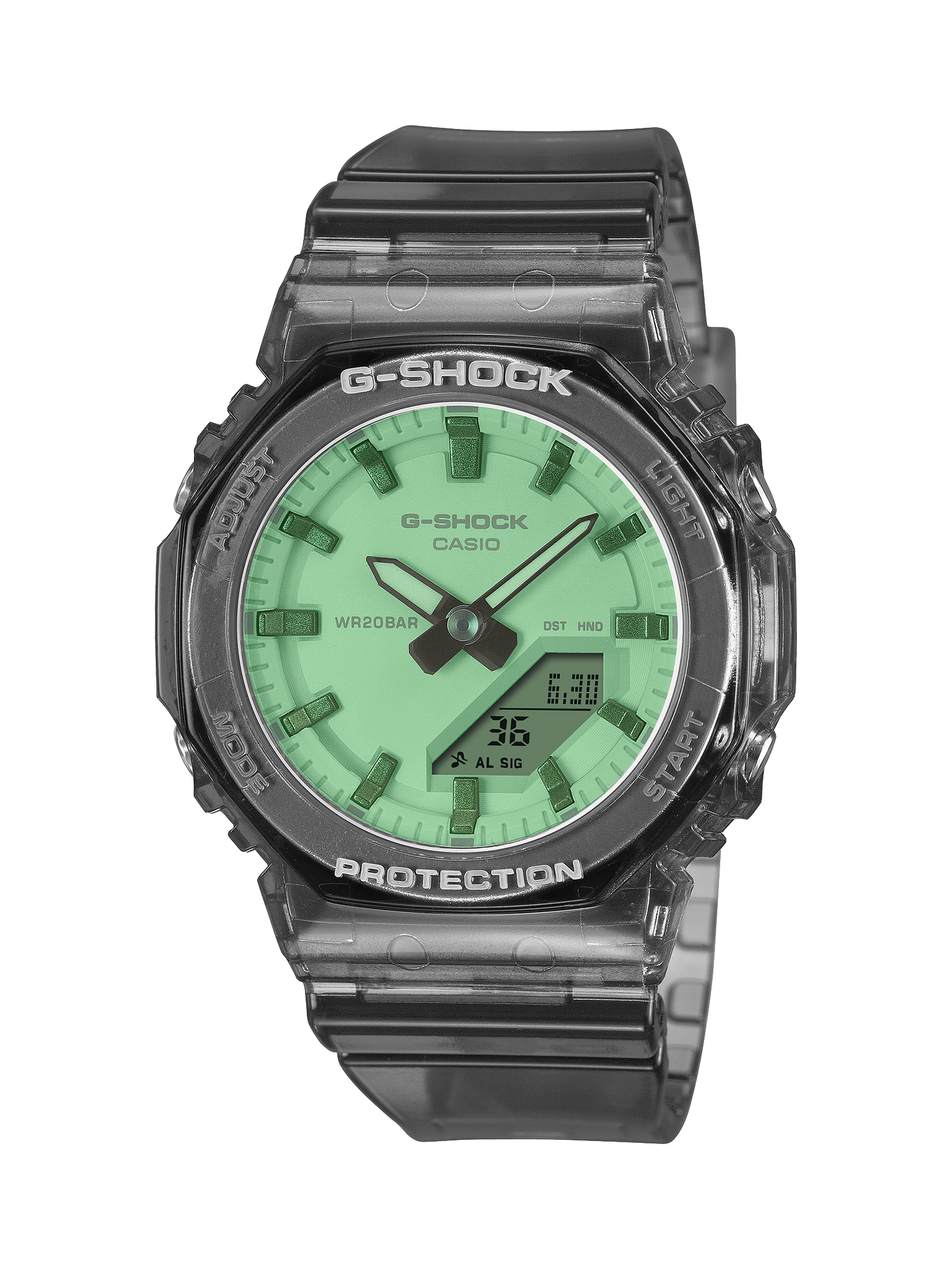 Paired with a semi-transparent case and band, the design creates a light, airy, resort-like impression. The compact size provides a comfortable fit for slimmer wrists, while the versatile design works well for everyday use and a wide range of fashion styles.