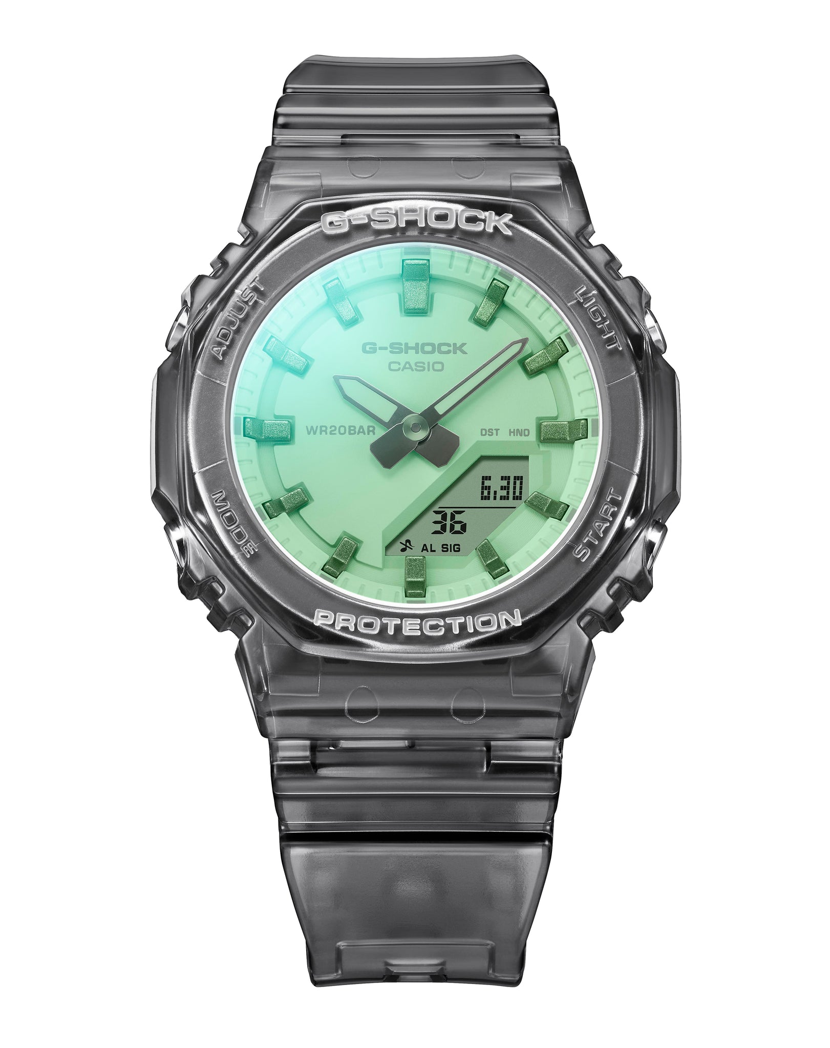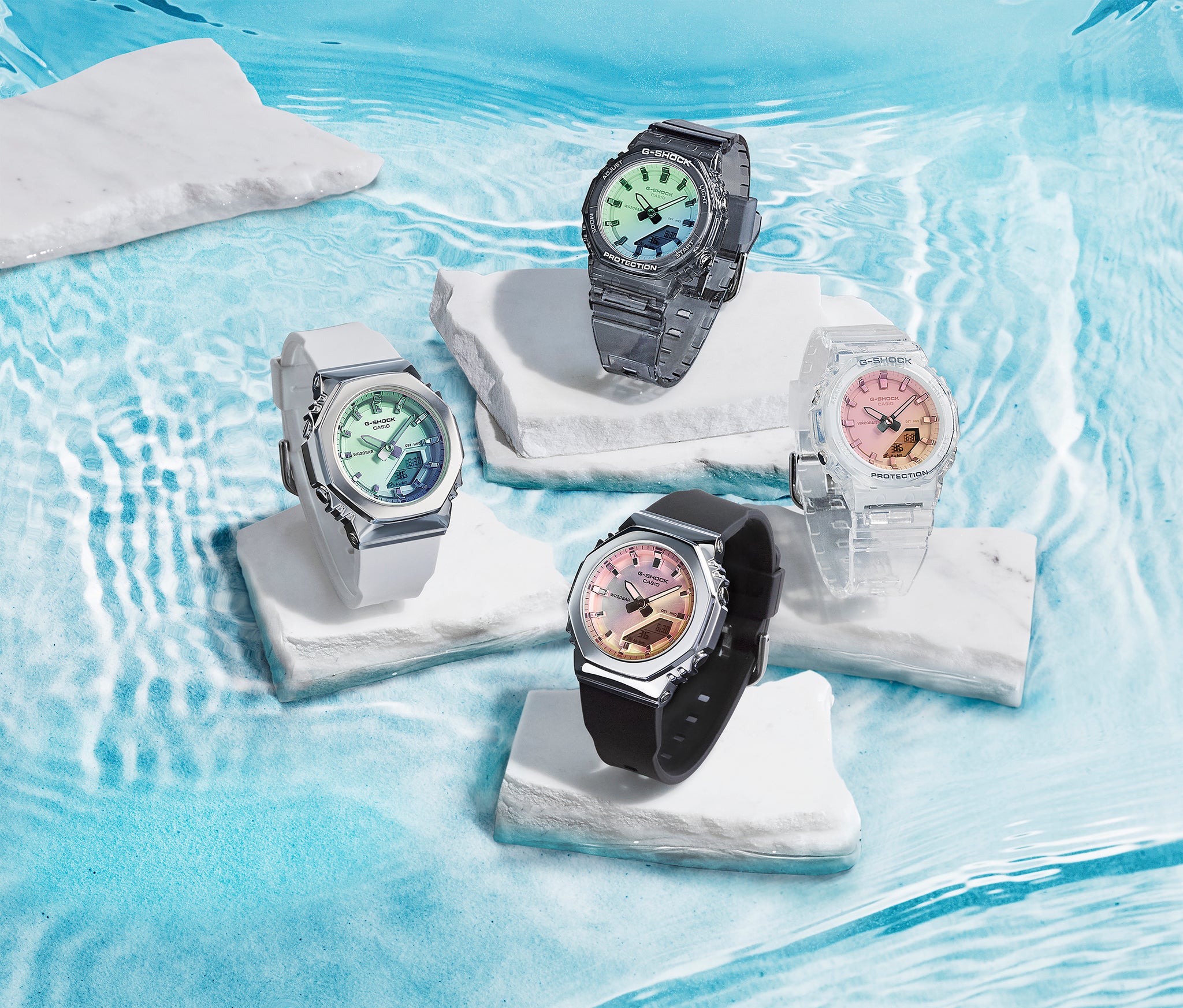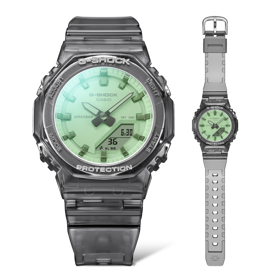 These models from the GMA-P2100 series feature a compact size and clean, simple appearance, inspired by the shimmering light of summer. The coloured dials use polarised vapour-deposited glass, with tones that change depending on viewing angle and wrist movement.