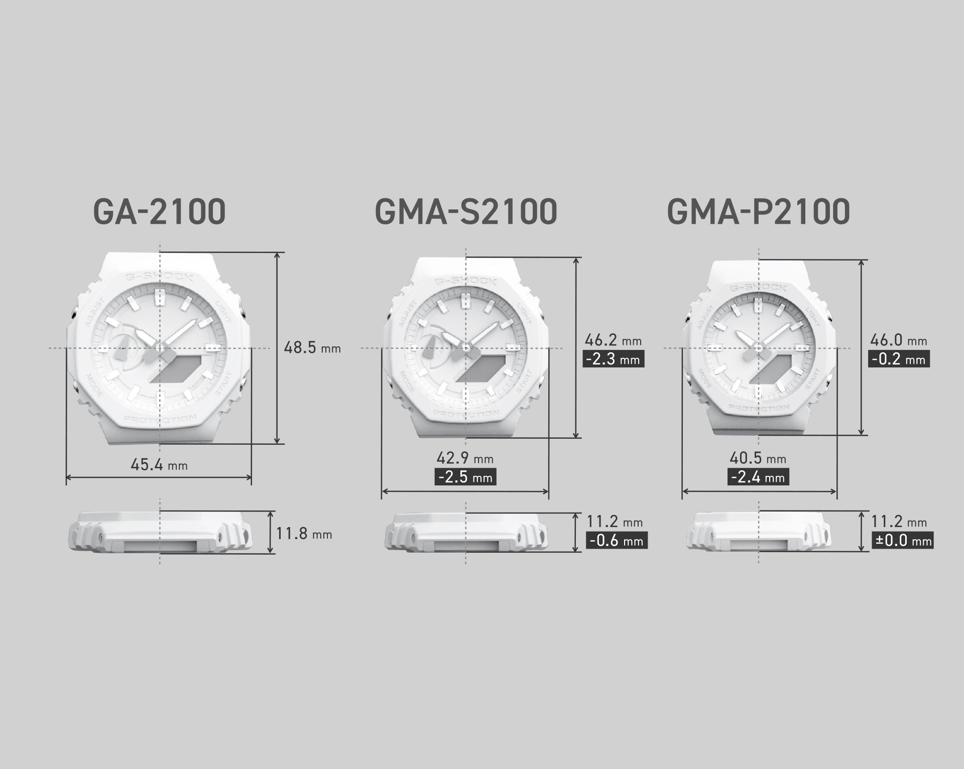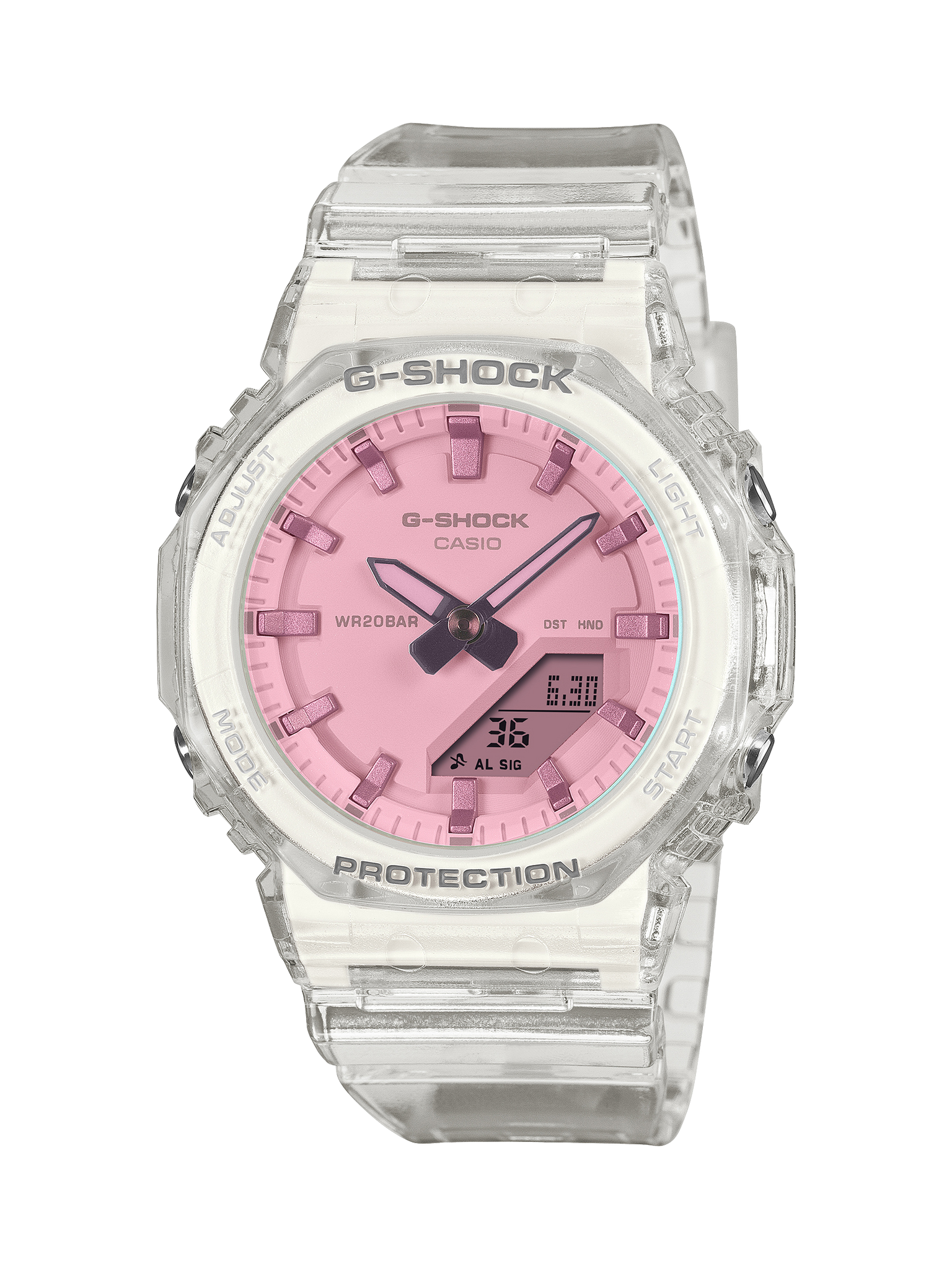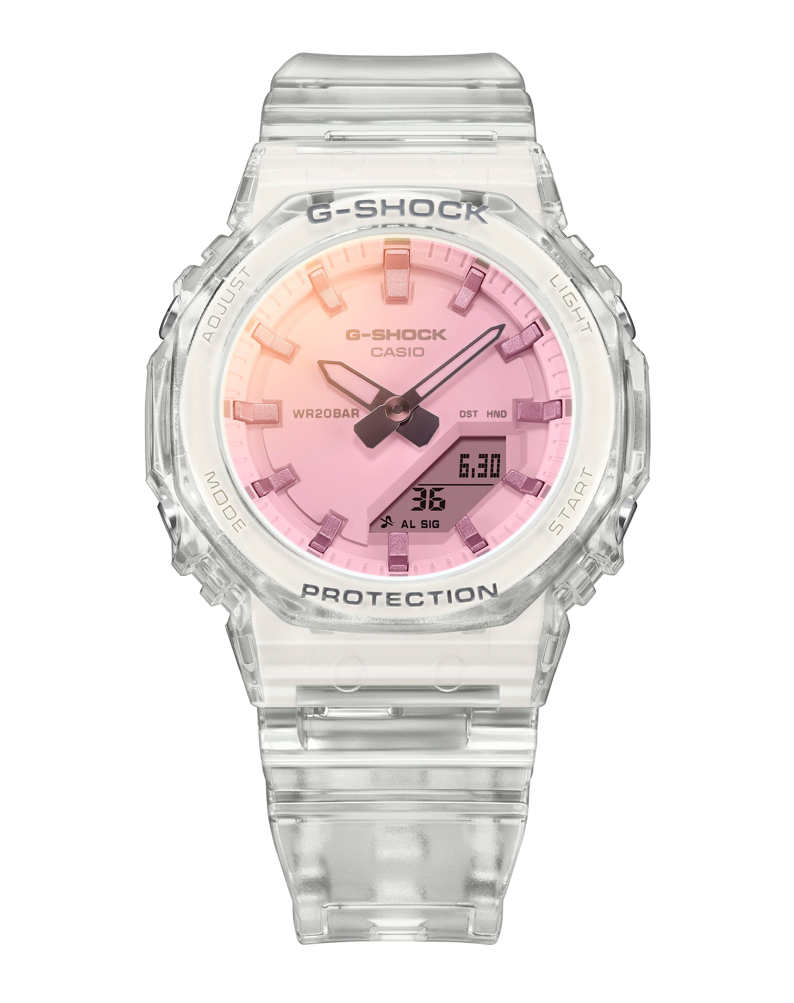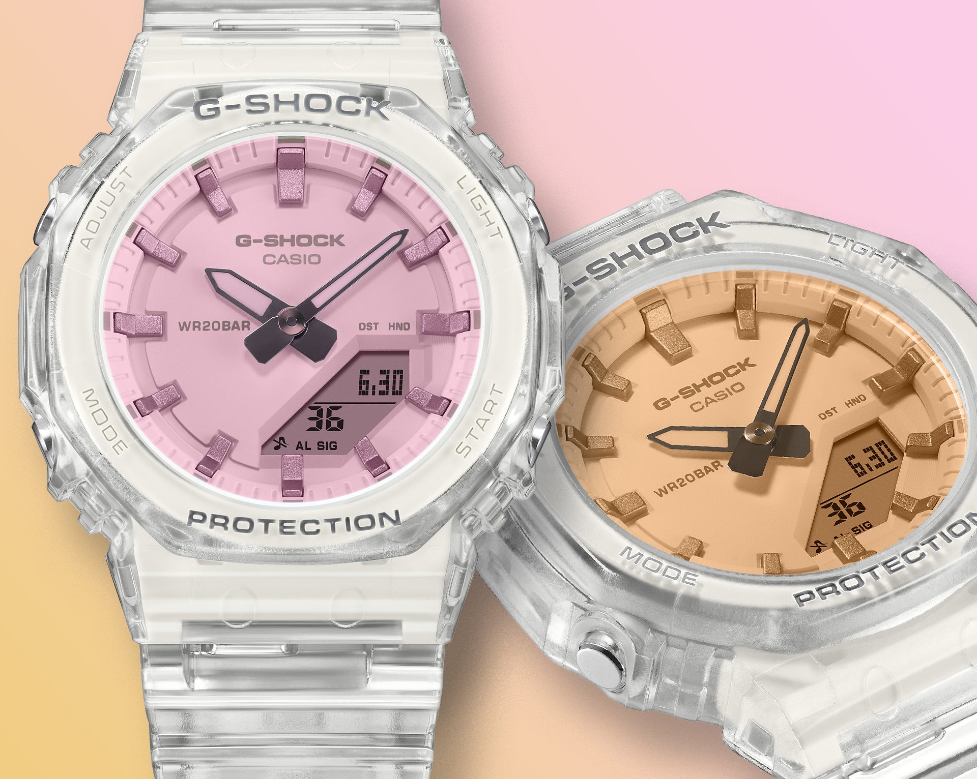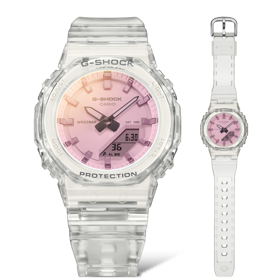 These models from the GMA-P2100 series feature a compact size and clean, simple appearance, inspired by the shimmering light of summer. The coloured dials use polarised vapour-deposited glass, with tones that change depending on viewing angle and wrist movement.
