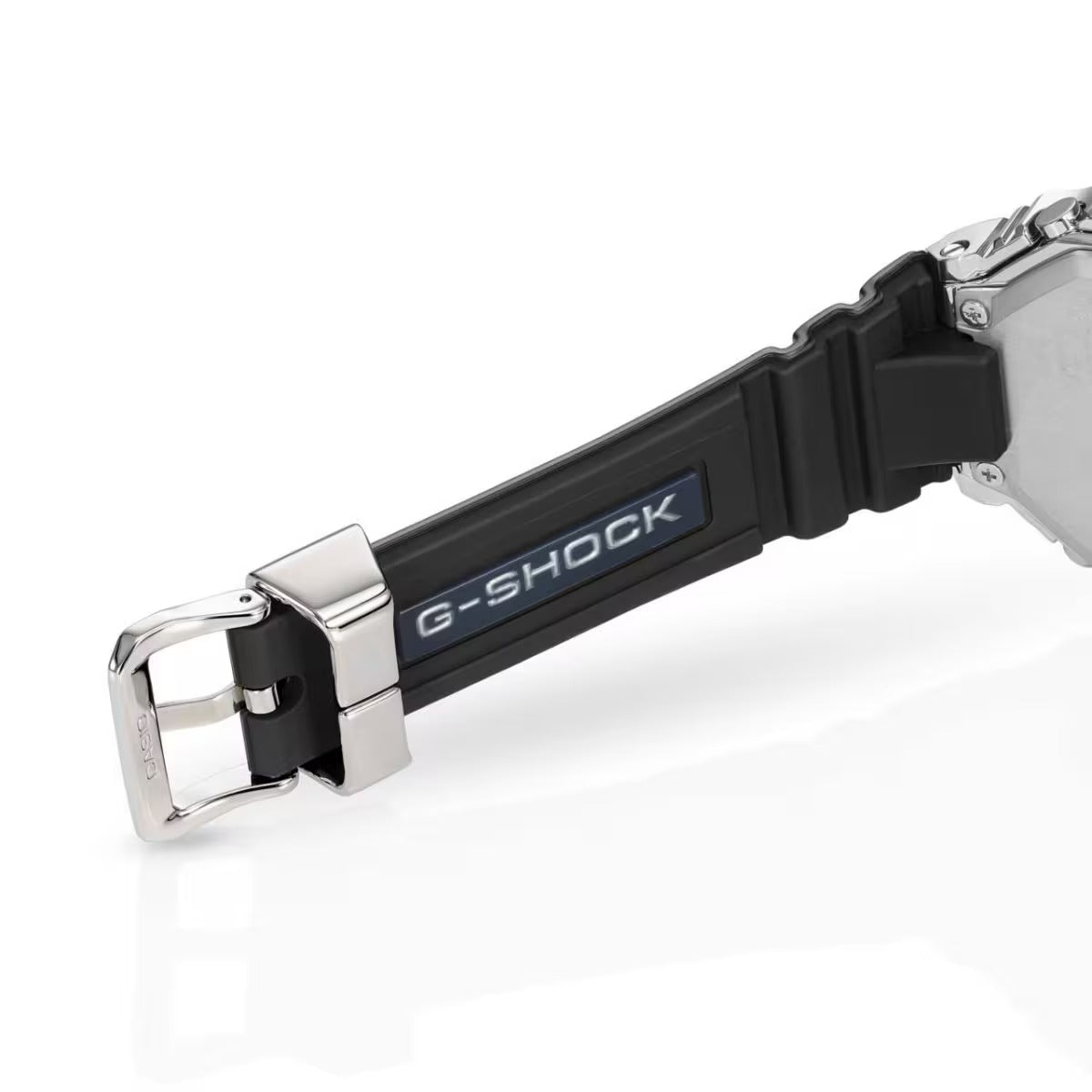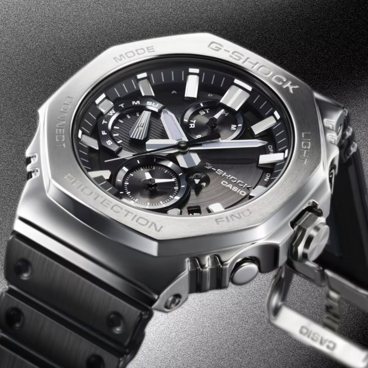 We take it way back with the octagonal bezel design of the original DW-5000C from 1983, but rendered in metal with stainless-steel case and bezel.