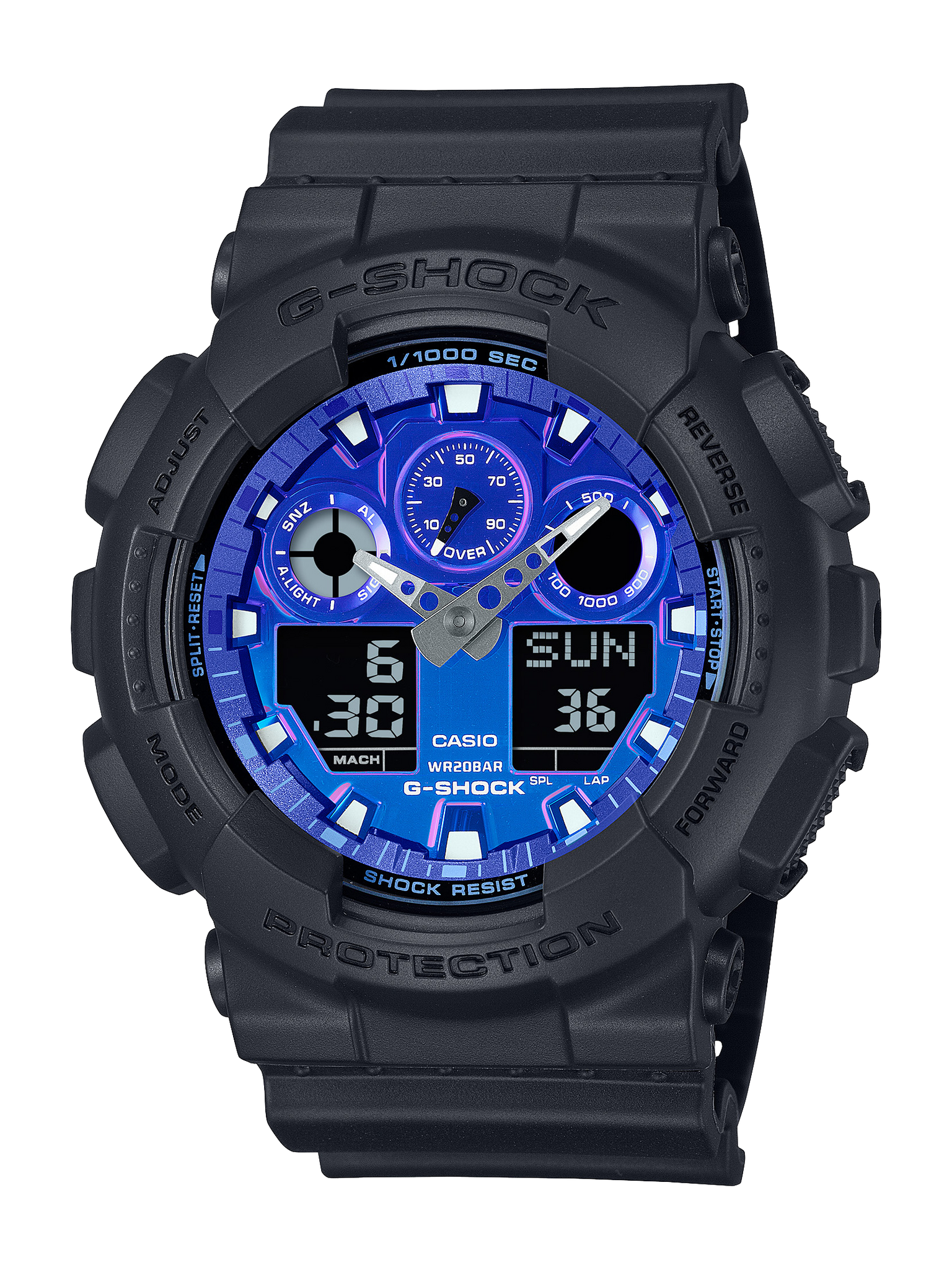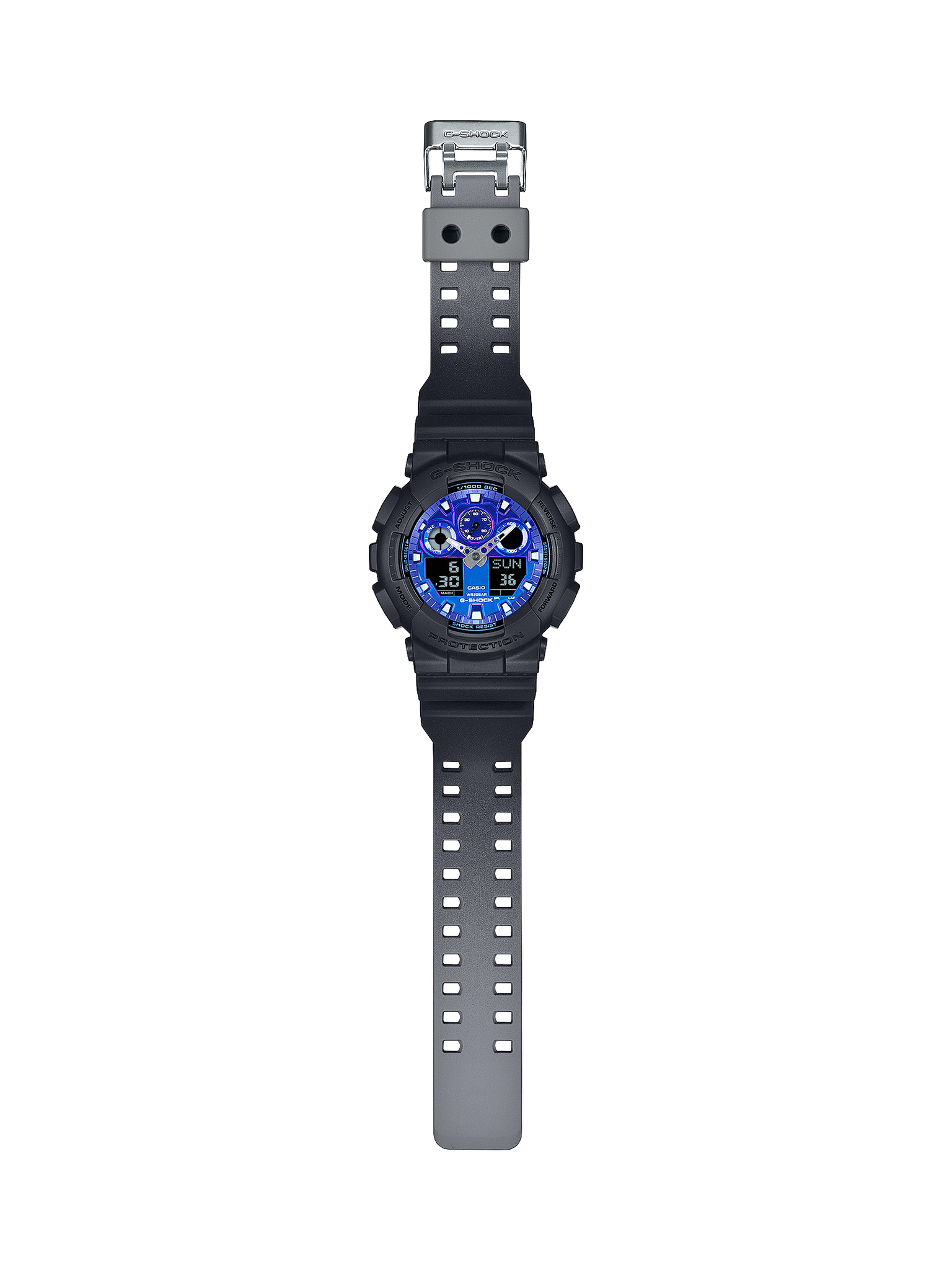 The GA-100FL-1A and GA-2100FL-1A have black bodies with a grey gradient finish that evokes the imagery of white smoke, complemented by cool blue gradient vapour deposition dials that represent the intense heat of flames. The GA-100FL-8A and GA-2100FL-8A, on the other hand, feature grey bodies with black gradient finishes that suggest dark smoke, paired with energetic orange gradient vapour deposition dials that symbolise the lower temperatures of a flame. The dials have vapour deposition finishes that showcase the two vibrant colours of cool blue and energetic orange. The black and grey of the bands recall the image of smoke and are accentuated by the striking colours of the dials.