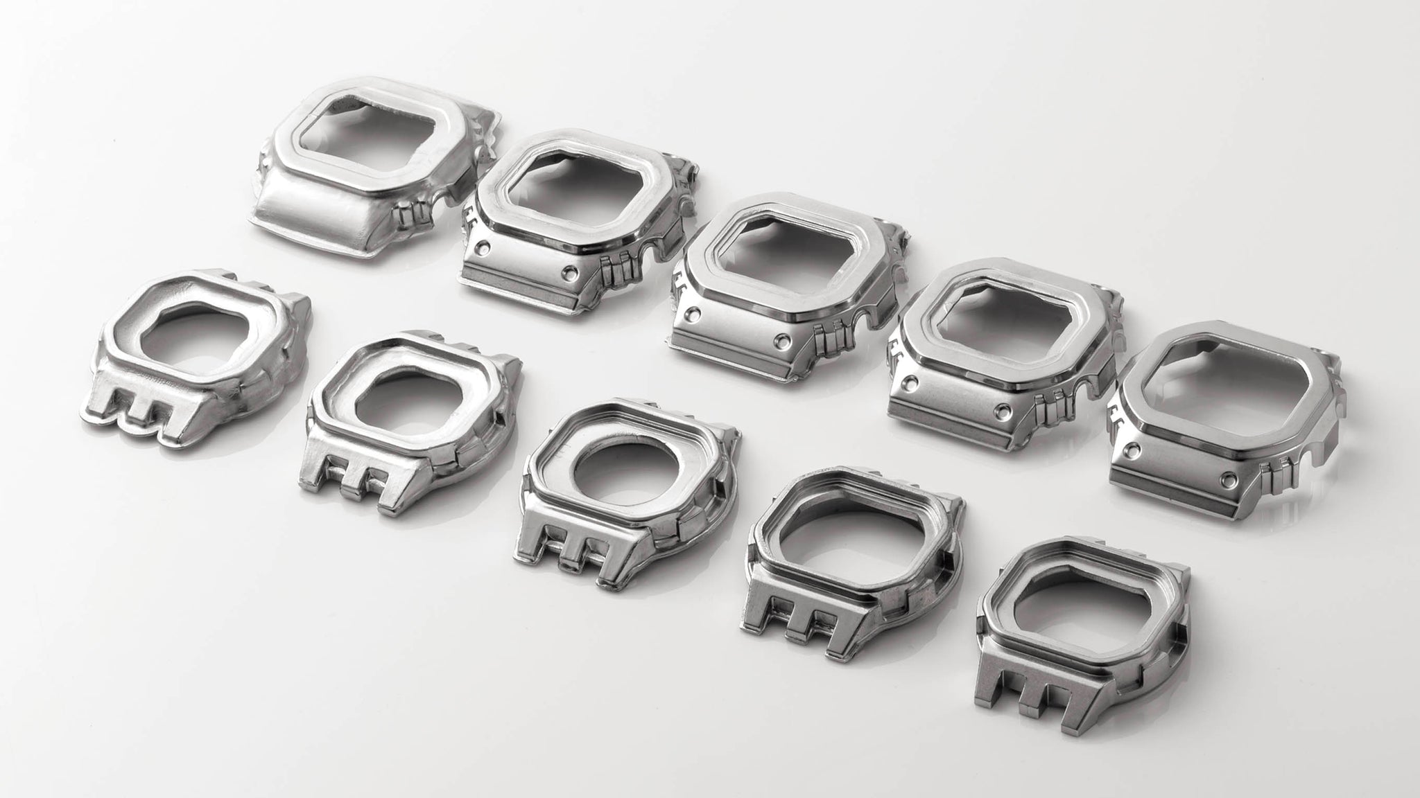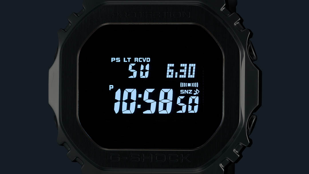 The metal band pieces are dimpled to reproduce the look of the resin band design of the very first G-SHOCK. The stainless-steel bezel is meticulously forged, cut, and polished for stunning depth and dimension. A hairline finish is applied to the bezel top and a mirror finish to the beveled edges, creating a smart metal timepiece that truly shines.