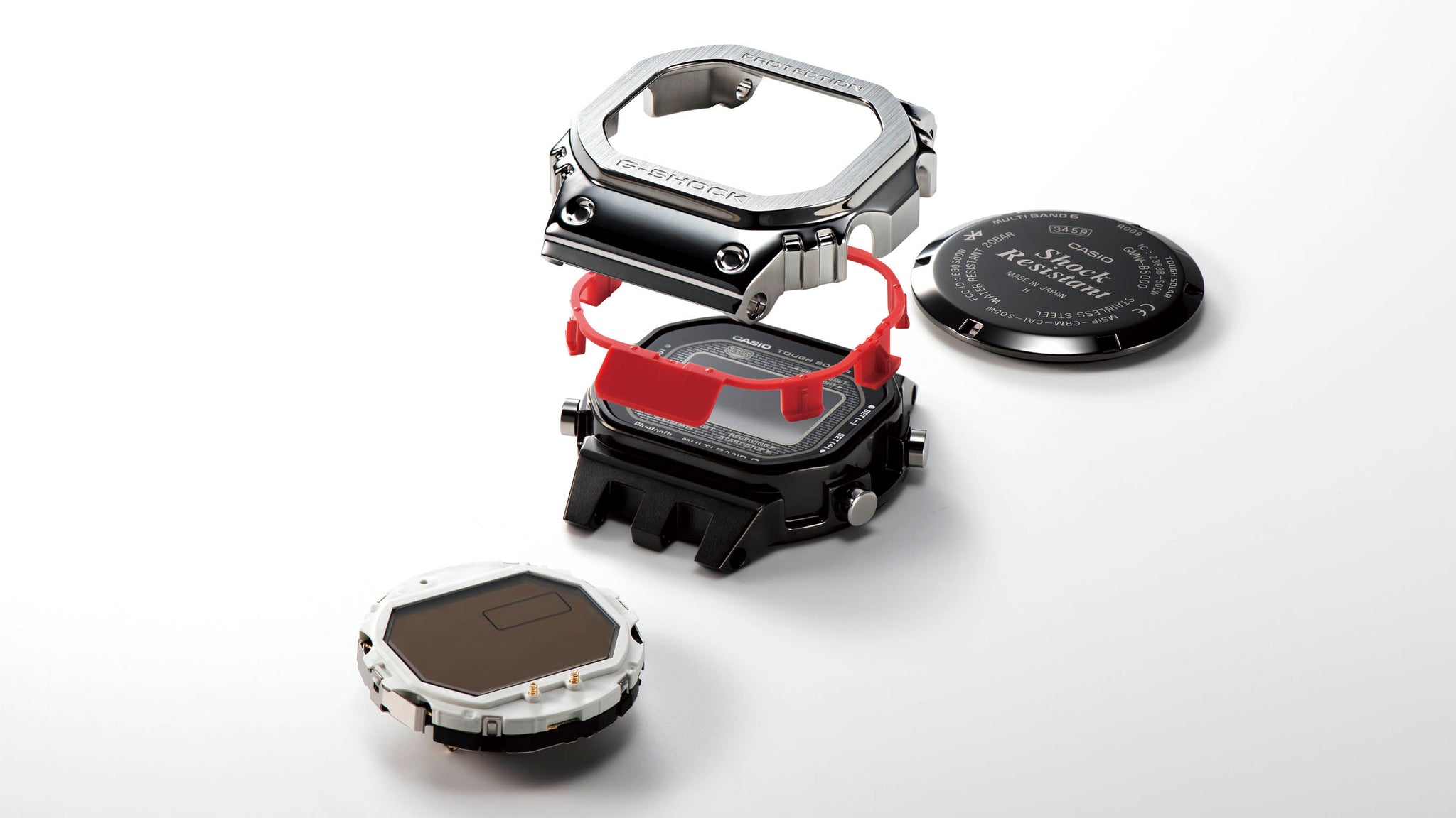 Buffering components made of fine resin are installed between the bezel and case, with a three-pronged structure dispersing shocks to the band’s connecting pipes, to deliver all the shock resistance of a G-SHOCK in a full-metal timepiece. And the case back features a screw-lock construction to ensure a tight seal.