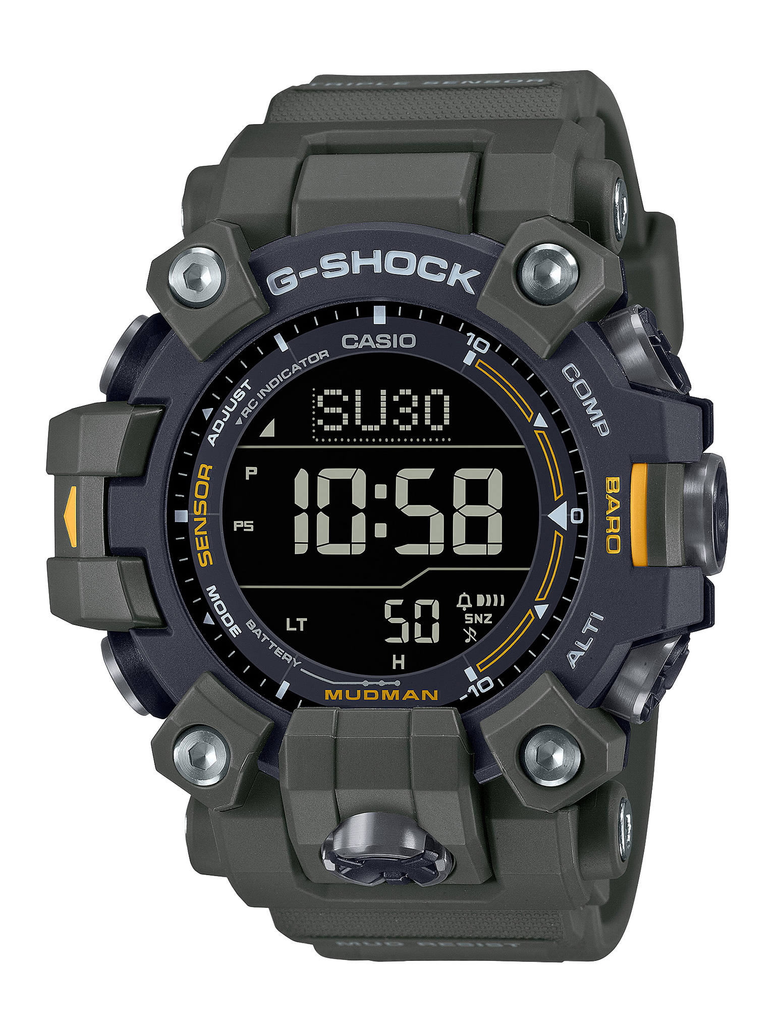 The G-SHOCK Master of G line of watches developed for professionals working in the harshest environments introduces the triple-sensor MUDMAN with mud-resist construction. The large, easy to operate front button and three direct sensor buttons on the side are shaped to drain mud and water and are protected by cylinder-shaped stainless steel components. The button shafts are equipped with gasket fittings to keep mud and dust out, as well, so you’re ready to take on the toughest of terrains.