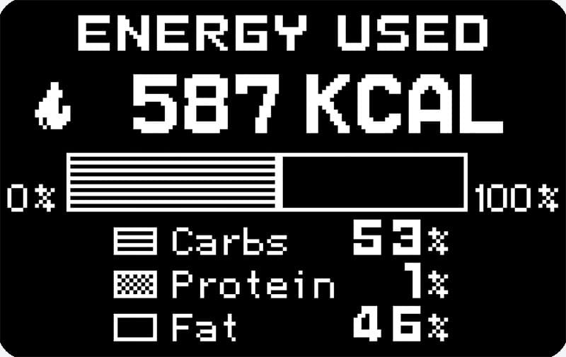 View how much of each energy source your body uses during training, broken down into fats, carbohydrates, and proteins for each session