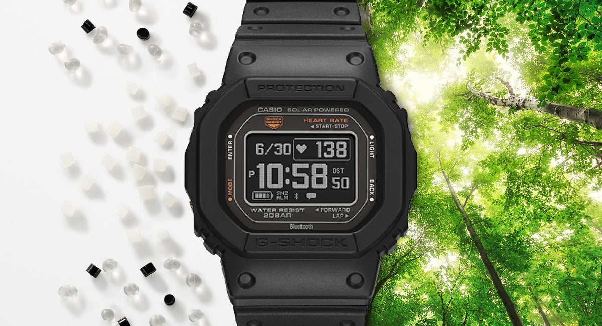 Key resin components of the case, bezel, and band are made with bio-based resins. In addition, the case features the first use of bio-based carbon fiber-reinforced resin in a G-SHOCK. Using renewable organic resources helps reduce the ecological footprint. Recycled materials are used for the packaging, as well. Everything about the design exudes eco-consciousness and healthy living.