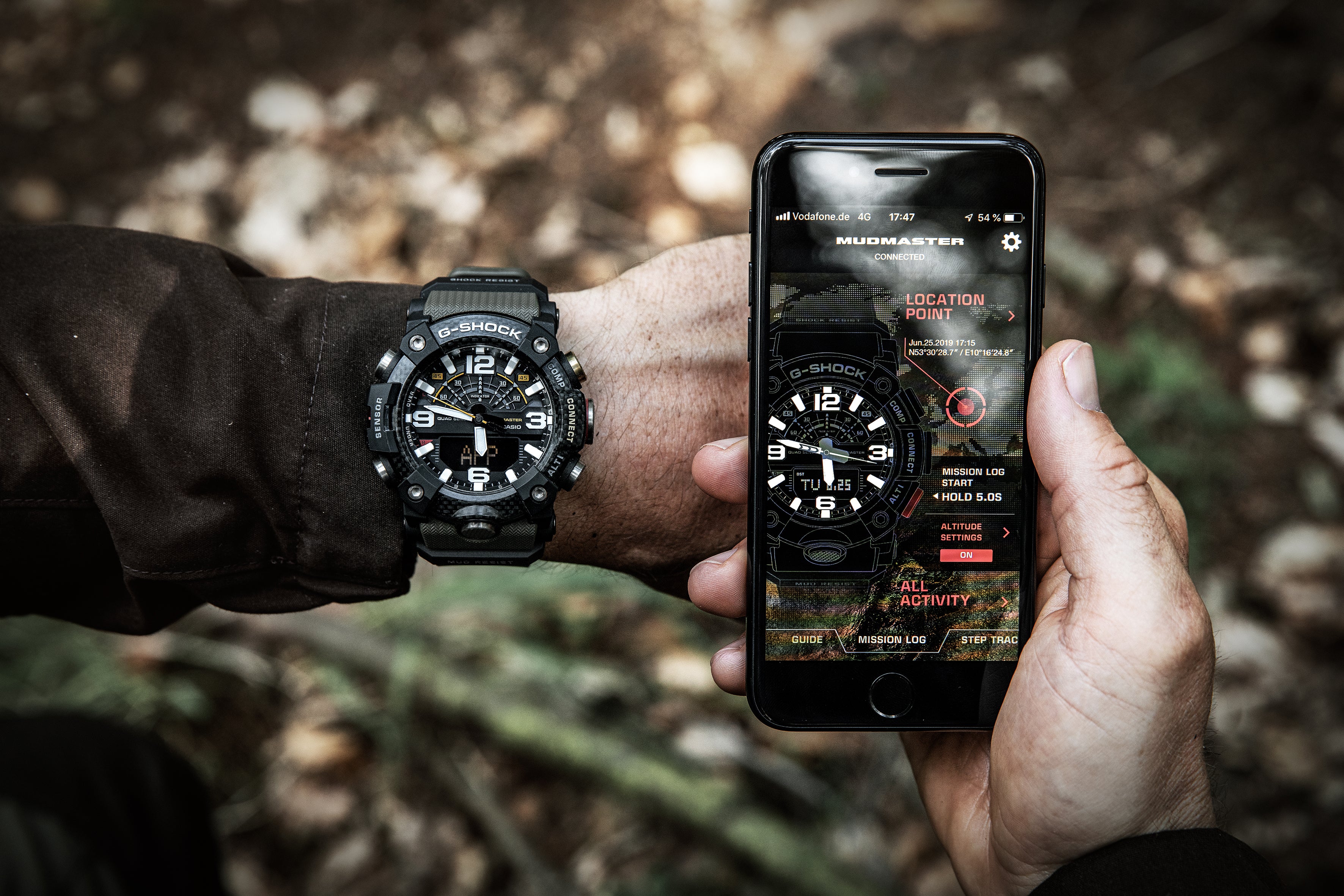The altitude measured by the watch and the course obtained from a smartphone’s GPS are automatically recorded to an app. An altitude point can be manually acquired and plotted on the map.