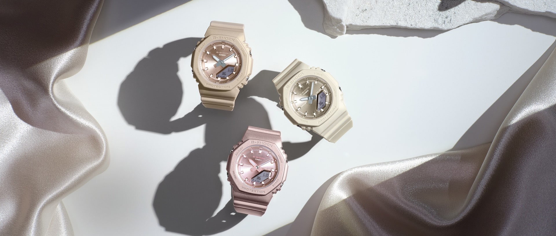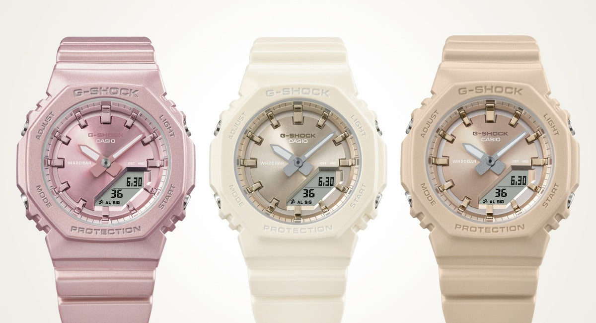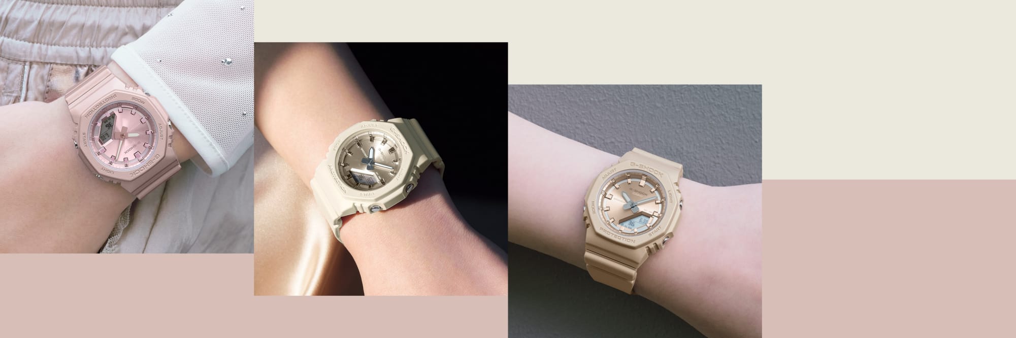 Introducing a new design maintaining the compact sizing and simple look characteristic of the GMA-P2100 series, but now featuring silky textural appeal in a lineup of three hues. Matte-finish pearlescent polarized coatings are applied to the bezel and band, while softly matted metallic colors are applied to the dial. The design featuring gentle coloration and subtle luster adds a look of elegance to the wrist.
