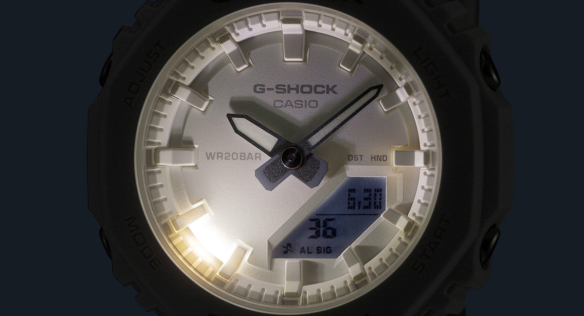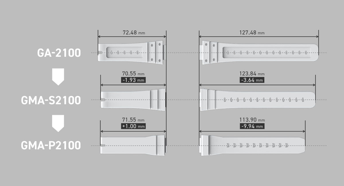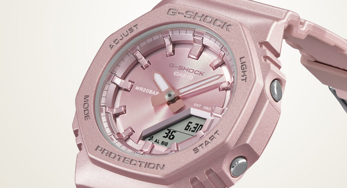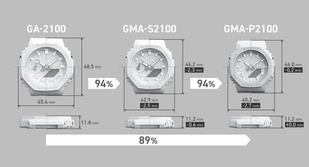 The GMA-S2100, already a smaller version of the GA-2100, is now even more compact. The length of the band has also been adjusted for easier wearability, resizing this timepiece to comfortably fit even slimmer wrists.