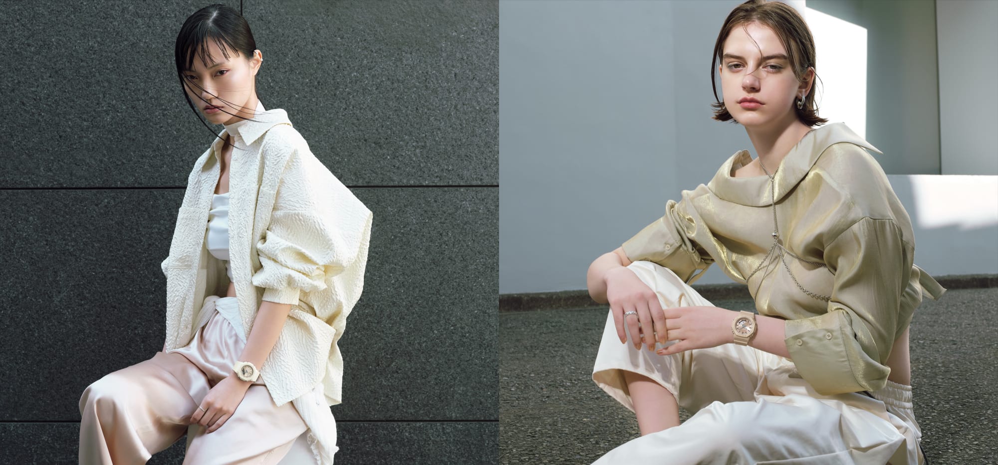 Pearlescent polarized coatings that change in appearance depending on the viewing angle are applied to the bezel and band, offering a gentle, elegant look as smooth as silk. A matte finish tempering the shine gives a natural taste to the design. A selection of three easy-to-coordinate colour options are offered: pink, white, and beige.