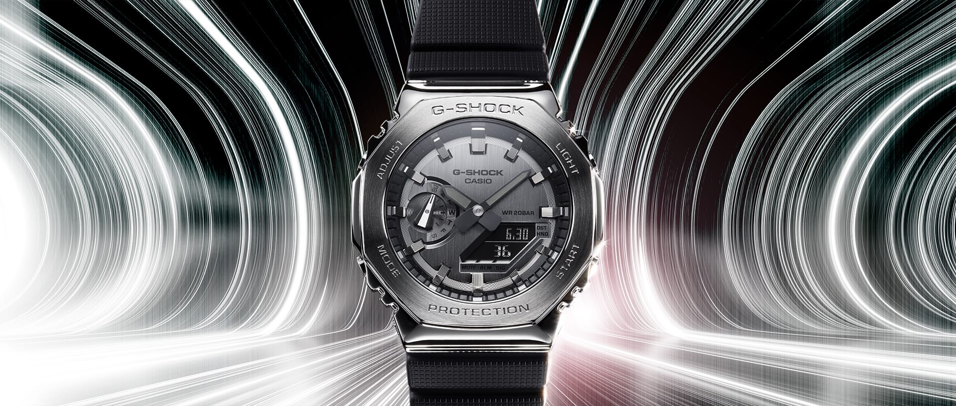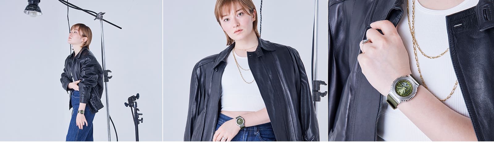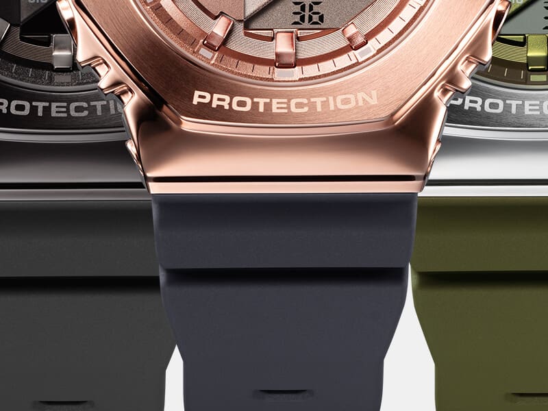 The watch features a shock-resistant structure with its metal bezel and glass fibre-reinforced resin case. Enhanced material strength enabled further slimming of the exterior while still satisfying the G-SHOCK criteria for shock resistance to achieve a mid-sized form that makes coordinating easy.
