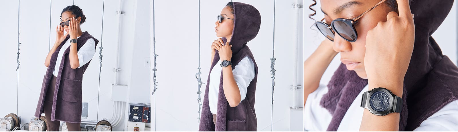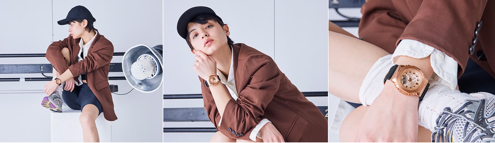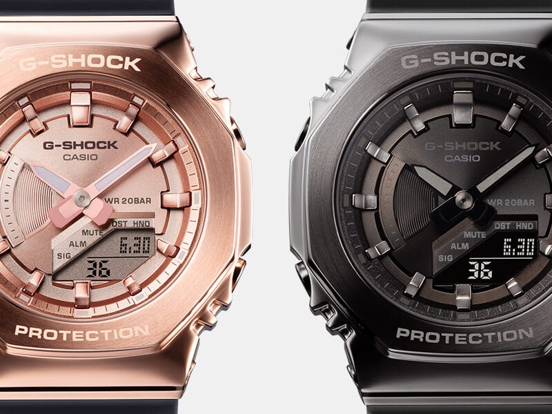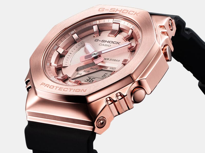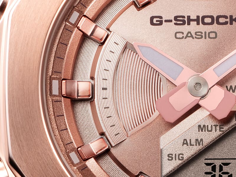 Colour variations are offered with pink gold IP (GM-S2100PG) and dark gray IP (GM-S2100B) applied to the metal components. This single-tone style gives the dial a sense of consistency and minimalist flair.