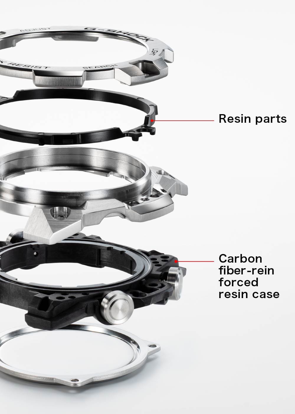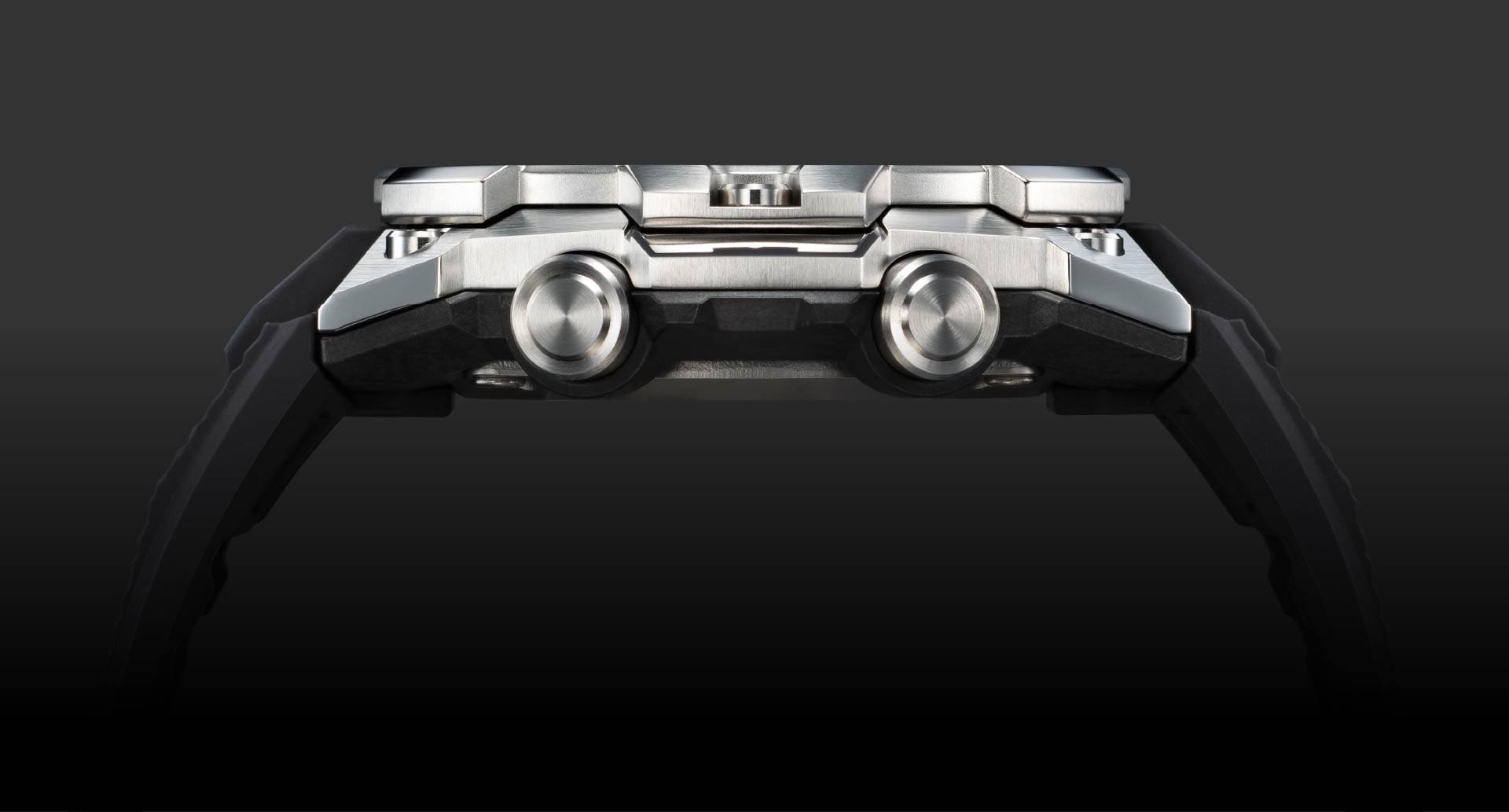 Carbon fiber-reinforced resin is used as the material for the case to ensure shock resistance while reducing weight and delivering the slimmest case in the G-STEEL line, at only 12.9 mm. The newly developed form of the button guards makes it possible to offer generously sized stainless steel buttons even in this extra-slim design.