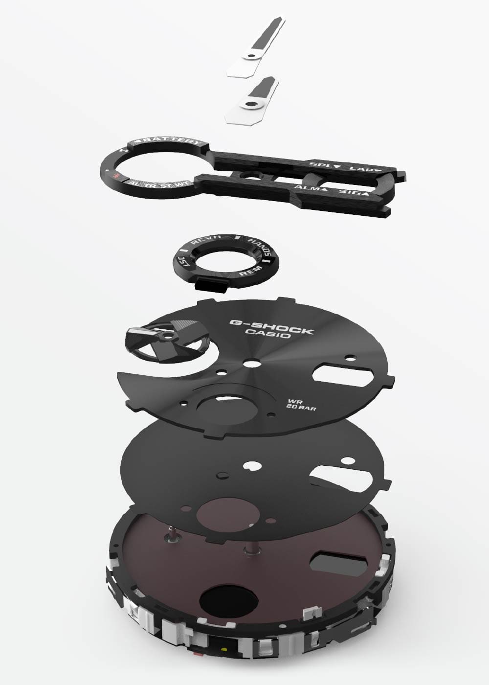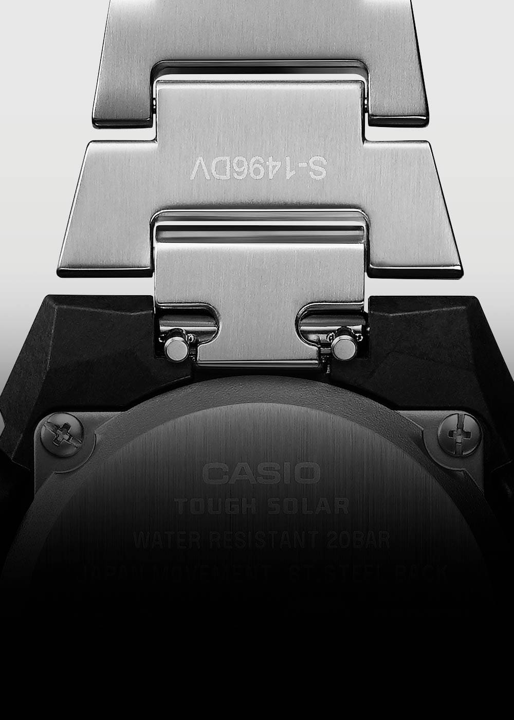 A power-saving module enables the use of an opaquer dial, and highly chromogenic dial colouration is achieved with multilayer vapour deposition. Vapour deposition is applied to the iconic G-STEEL dial indicator and bridge parts as well as parts of the face design, proving the meticulous care taken through the very last detail.
