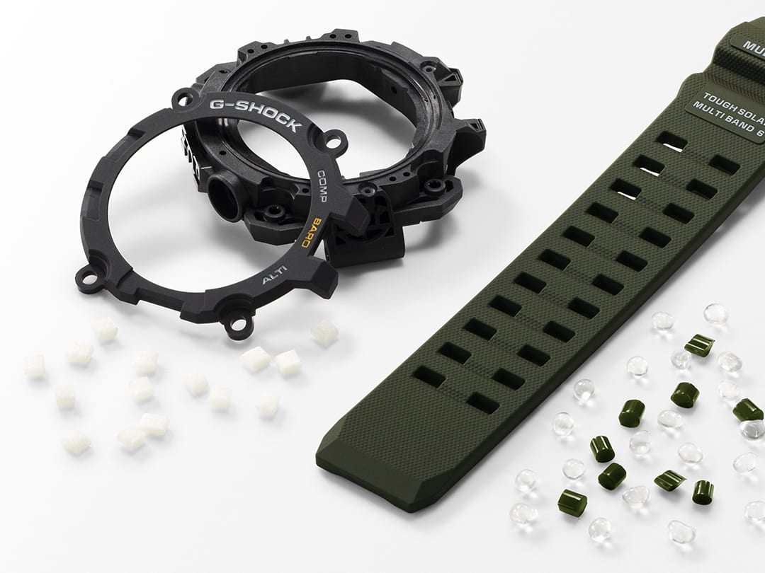 The case, bezel, and soft urethane band are made with bio-based resins. Produced using renewable organic resources such as castor oil plants and corn, this material is expected to help reduce environmental impact.