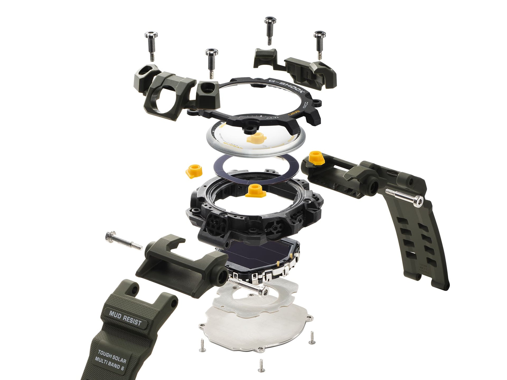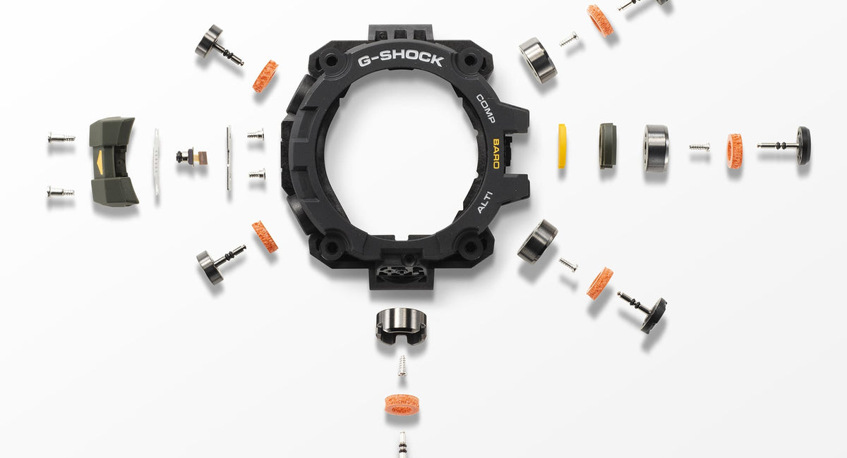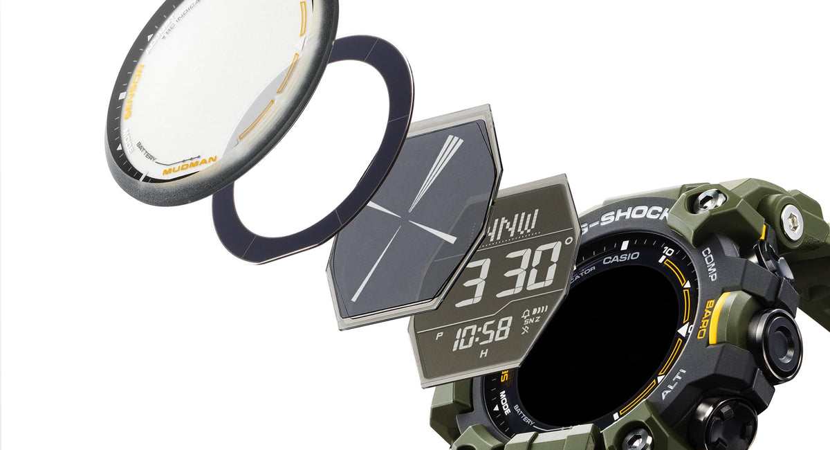 Inspired by professional gear built to perform in the harshest conditions, the solid, rugged design delivers strength, slimness, and ease of use. Reduced bezel height is achieved by cutting the glass and employing a new glass adhesion method, while the Carbon Core Guard structure ensures high rigidity to realise a slimmer, more compact form. Even while incorporating Triple Sensor technology and a dual-layer LCD, the case measures just 14.8 mm slim. The multi-component protector and independent front button give the watch a sense of presence with an even greater look of toughness.
