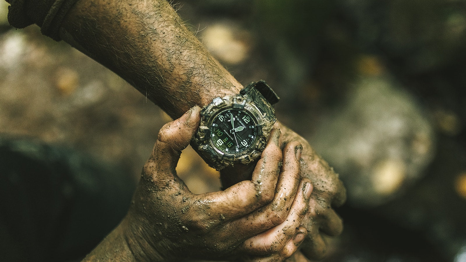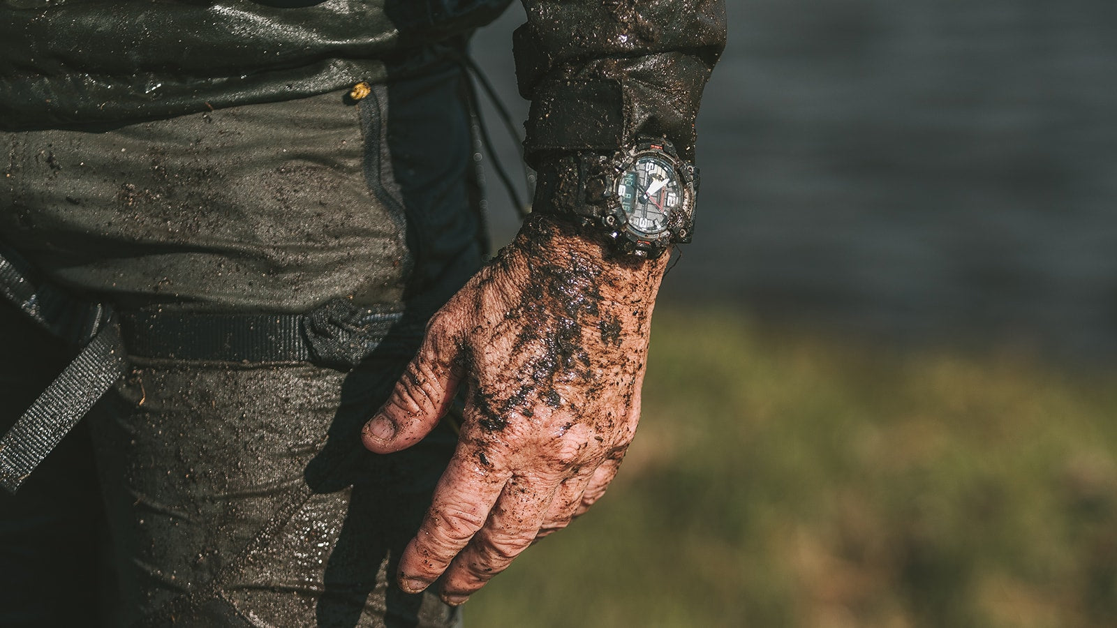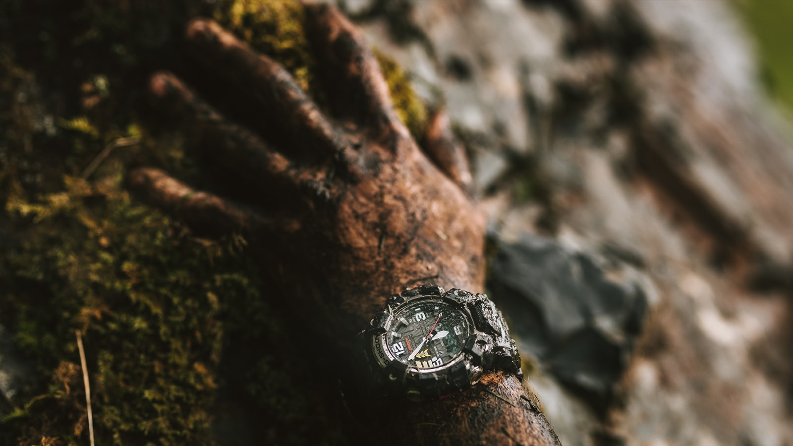 Retains the dust- and mud-resistant structure of the MUDMASTER series and adds a forged carbon bezel and Carbon Core Guard structure to make the watch smaller and lighter. With advanced technologies including solar-powered radio control and triple sensor technology, the watch supports land missions in the harshest conditions.
