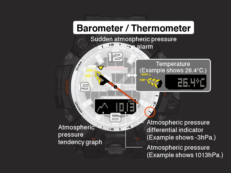 Triple sensor (digital compass, altimeter, barometer/thermometer) senses natural changes
