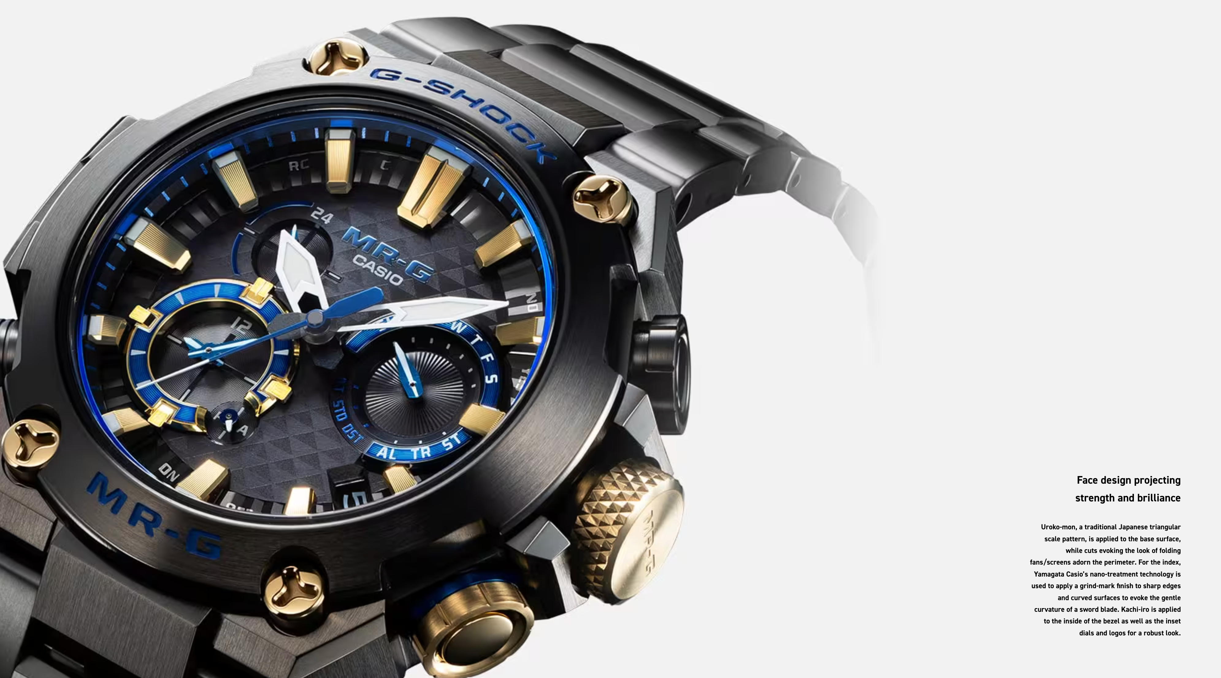 A traditional Japanese hue called kachi-iro, literally “victory colour,” accents the watch’s design. A shade of deep navy blue meant to ensure victory, the colour adorned the helmets and armour of samurai warriors who achieved distinction through triumph. The spirit of these warriors and their approach to life shines through in every aspect of the design. From materials and construction to functionality — all are informed by uncompromising particularity. This new MR-G stands as heir to the time-honoured Japanese traditions of strength and aesthetic beauty.