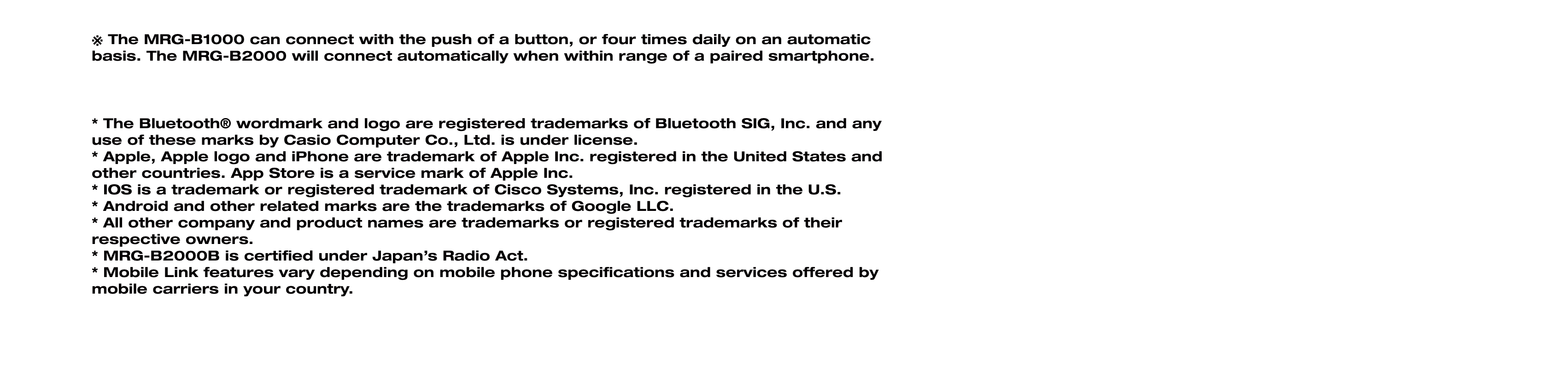 * Bluetooth® wordmark and logo are registered trademarks of Bluetooth SIG, Inc. and any use of these marks by Casio Computer Co., Ltd. is under license.