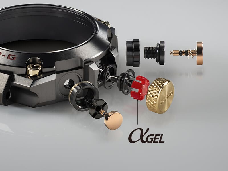 The Clad Guard Structure builds shock resistance into the crown and buttons, ensuring toughness and ease of operation while reducing the case size. αGEL inserted into the head cover of the crown helps to absorb shocks.