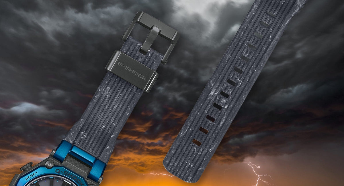 This highly distinctive design takes inspiration from storm chasers — the intrepid researchers who head straight into harsh weather conditions like tornadoes to collect vital meteorological data. The watch conveys the toughness these critical missions demand while also evoking the awesome grandeur of nature. Special design features including a rainbow IP bezel, multi-layered carbon frame, and mixed-color molded resin band. These innovative materials deliver the beauty of form and striking color schemes that are unique to Casio MT-G.
