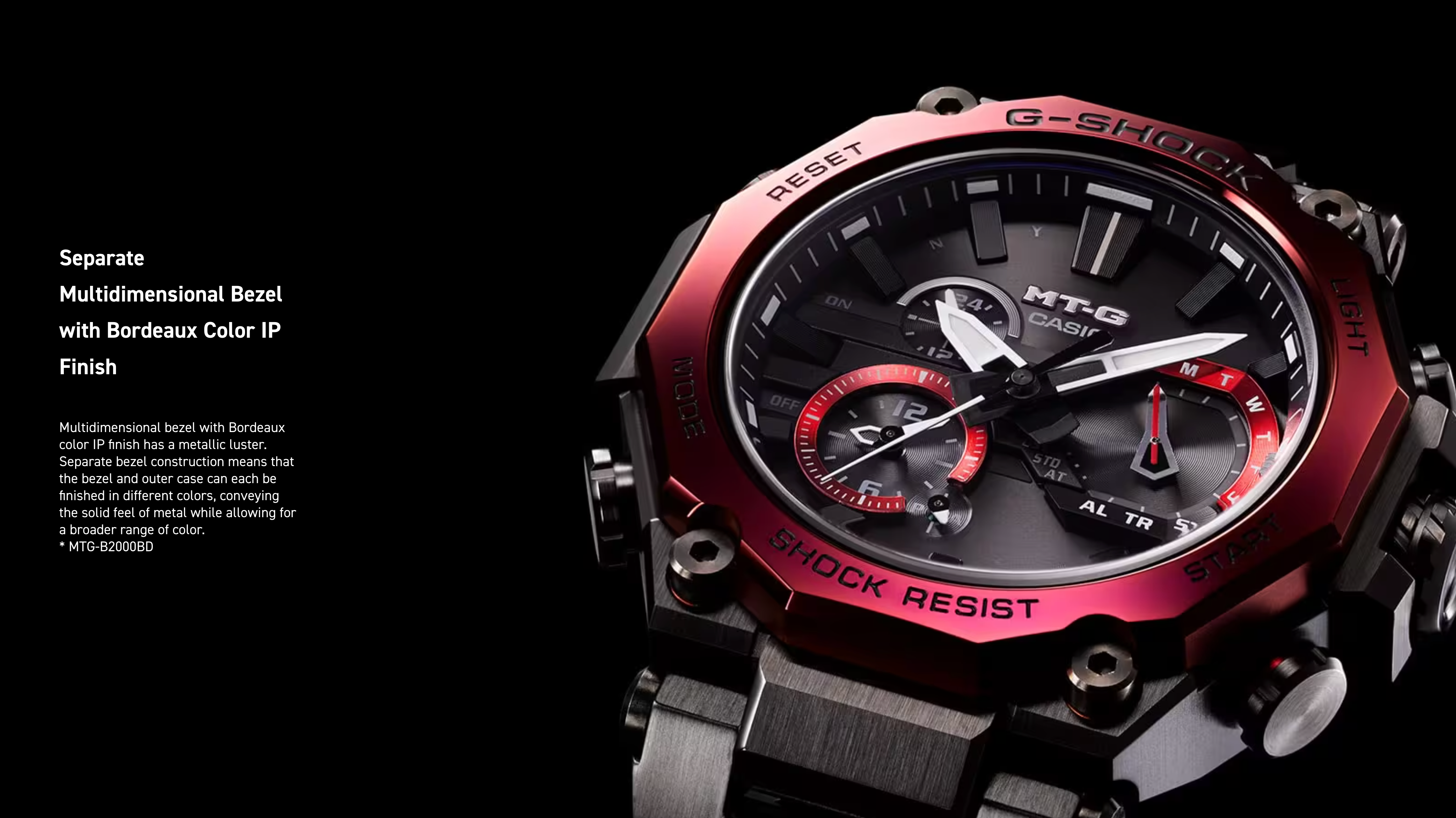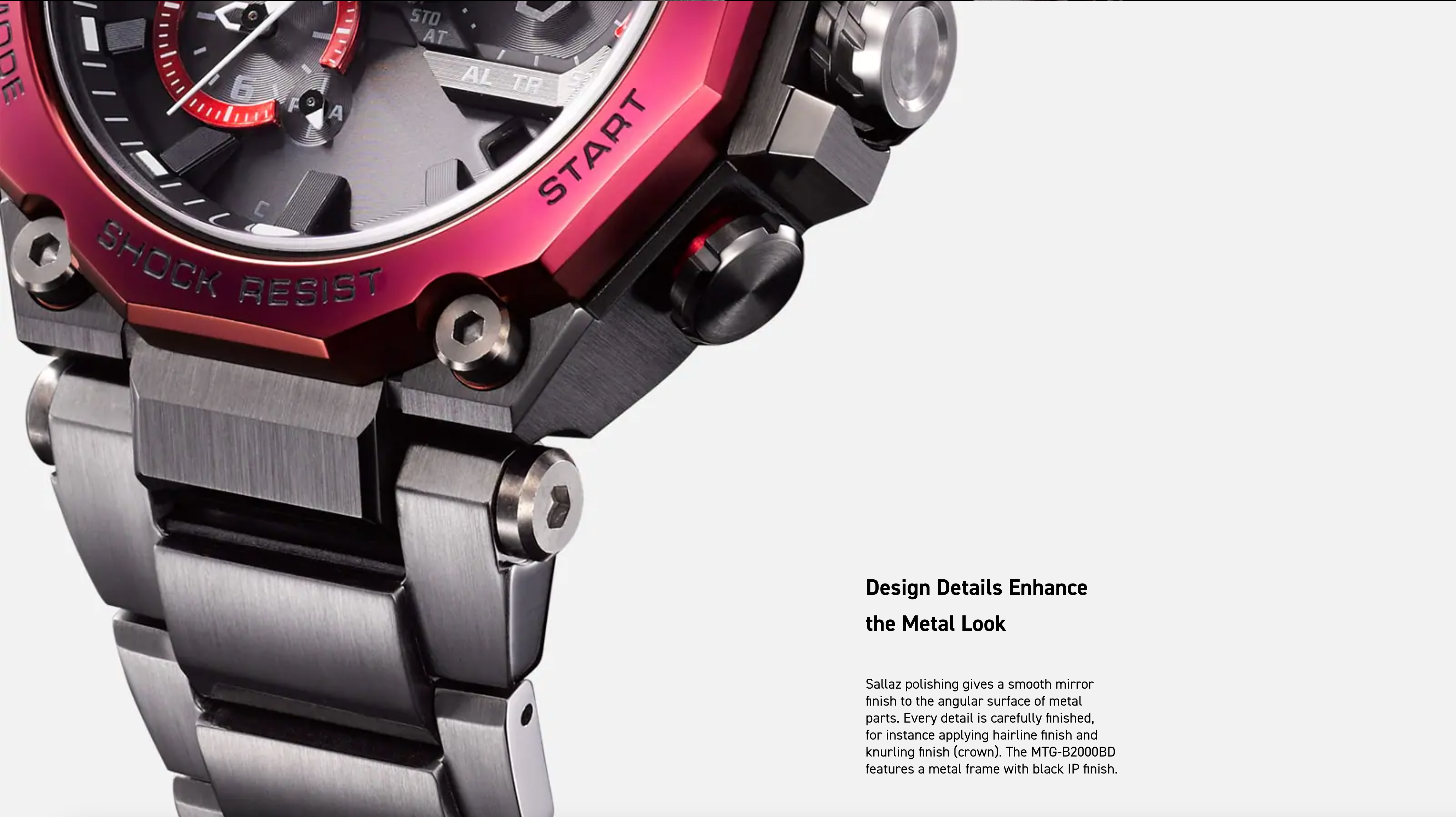 A metal band with fine resin parts offers a bold look and an excellent fit. Metals parts are hollowed out using metal injection molding (MIM), making the MTG-B2000 roughly 15% lighter than the predecessor model (MTG-B1000D). Double slide lever structure makes it effortless to put on and remove the watch.